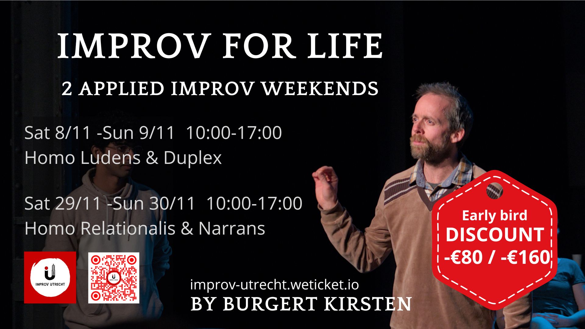 Improv for your personal development. Burgert Kirsten's highly appreciated 7-week course, now in 2 weekends. Weekend 8-9 november "Ludens (Playful Human) & Duplex (Polarity Human)" Weekend 29-30 November "Relationist (Relational Human) & Nerens (Storytelling Human)" €279 per weekend (€230,58 ex VAT) early bird price € 199 early bird both weekends € 340